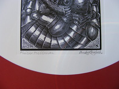 Philip Pullman has added a line from the text and his signature underneath the engraved portrait by engraver and blockmaker Chris Daunt: